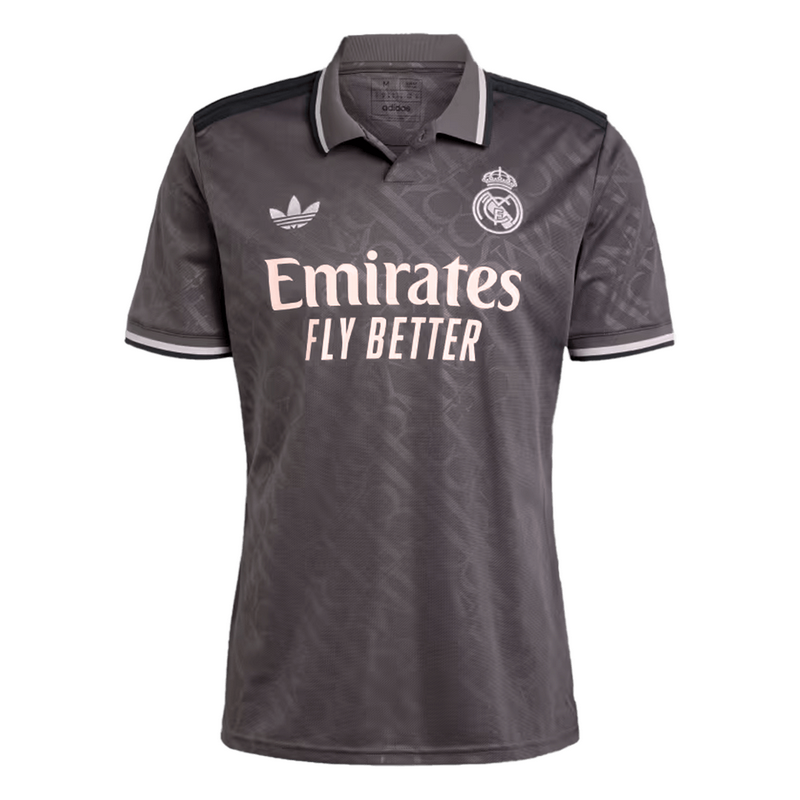 The Real Madrid 2024-25 third shirt has a charcoal brownish-grey (Charcoal) main color combined with 'RMCF' embossing all over the shirt for a unique look.