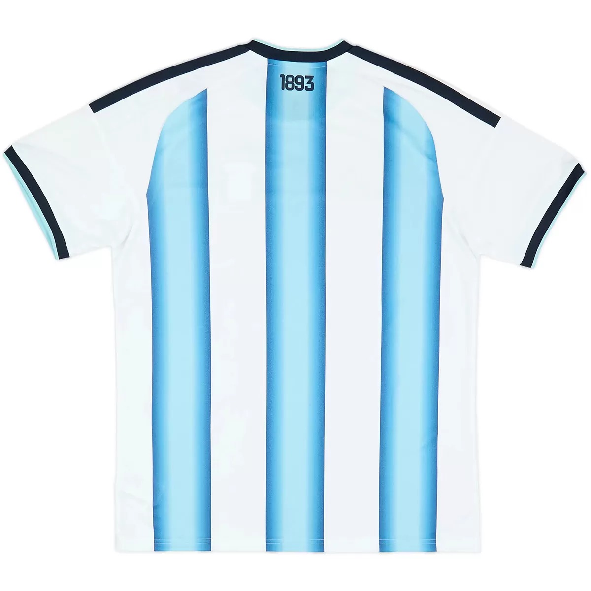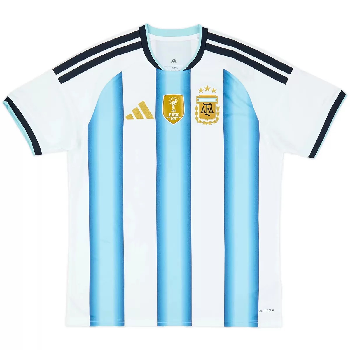 Details: The Adidas Argentina 2026 home jersey includes navy Adidas stripes on the shoulders and sleeve cuffs, along with navy names and numbers with a white border using the Adidas 2026 World Cup typeface.