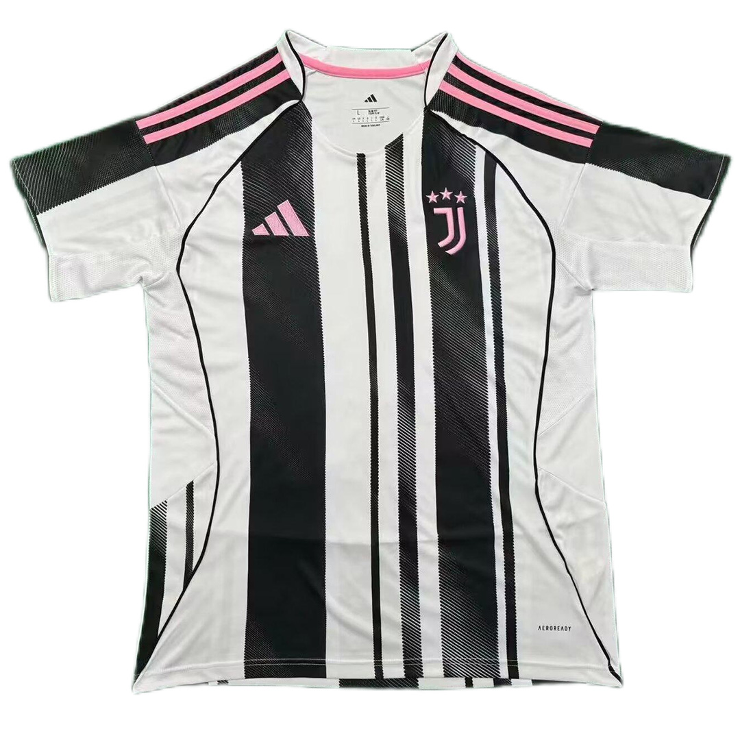 The Adidas Juventus 2025-26 home shirt combines the club's classic white and black with pink logos and piping, a first in the team's history.