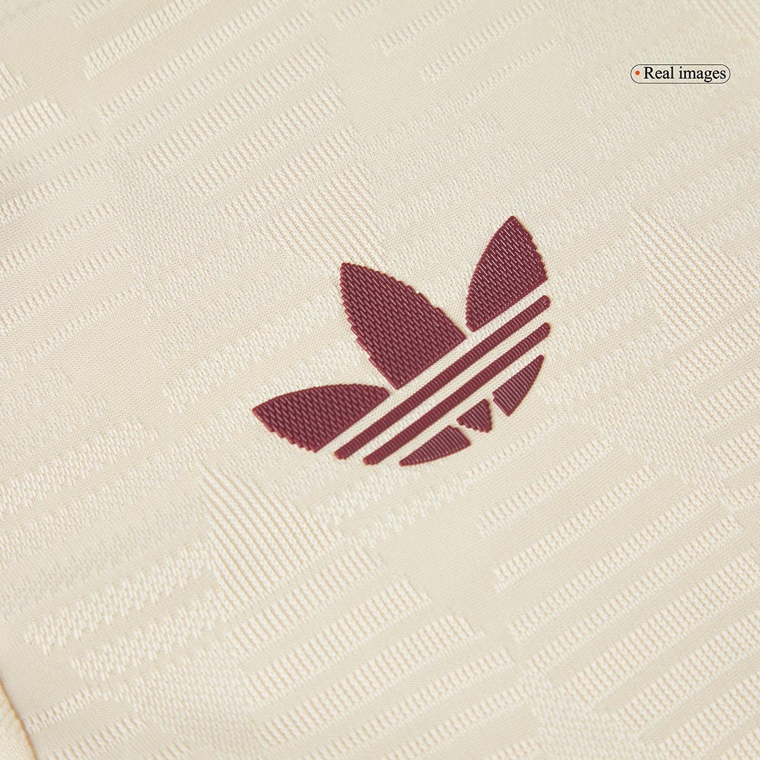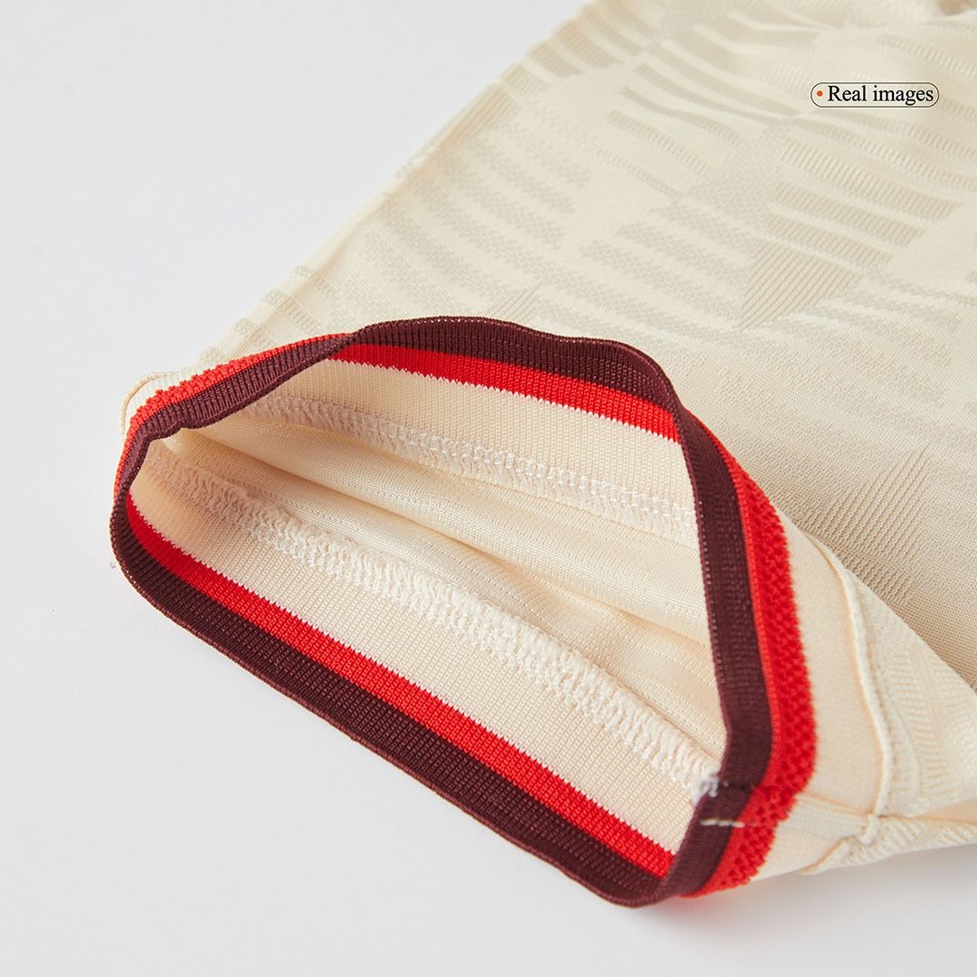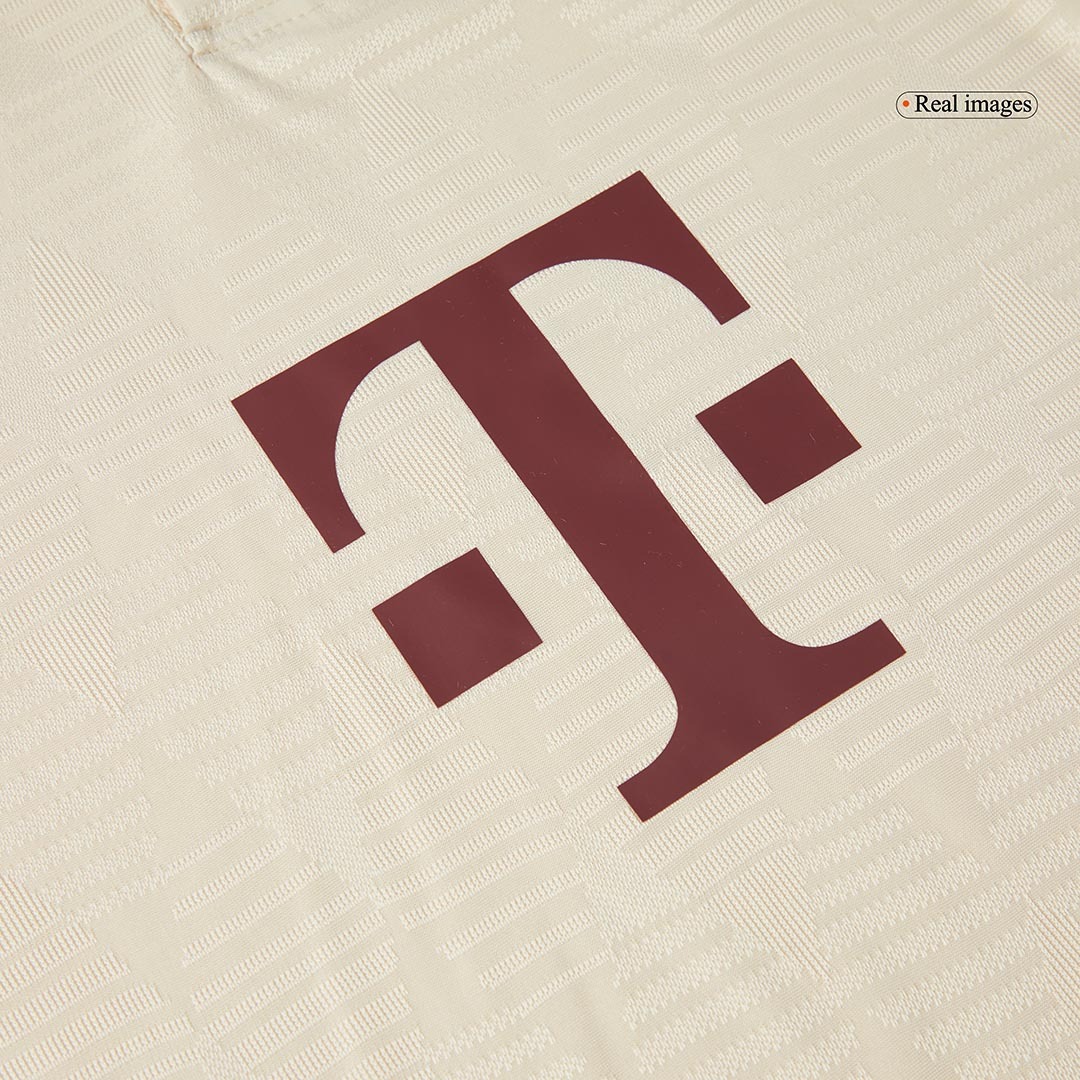The new Bayern München 2024-25 third football jersey is off-white (officially Linen) with dark red logos plus bright red trim.